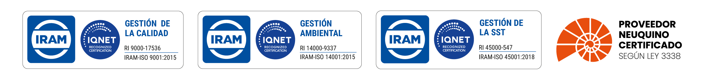 Nuestro compromiso con la excelencia se respalda en la implementación de un sistema de gestión de calidad bajo las normas ISO 9001, gestión ambiental ISO 14001 y seguridad y salud en el trabajo ISO 45001, asegurando cumplimiento normativo, sostenibilidad y confianza operativa. También tenemos Certificado de Empresa Proveedora Neuquina conforme a los requisitos establecidos por la Ley Provincial N°3338.